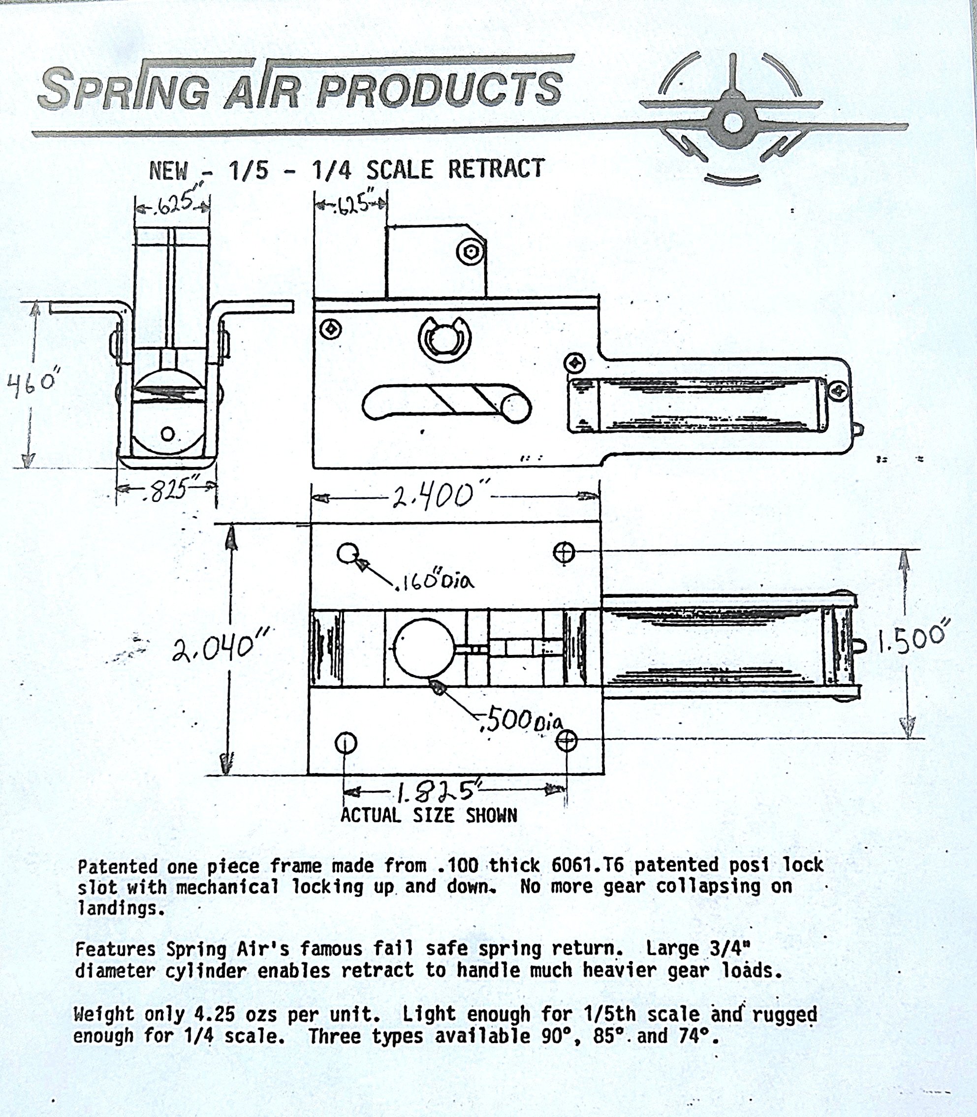 This is our 1/5 scale air up with patented fail safe spring down. fit most of your popular 1/5 scale planes that require 90 degree and 85deg retracts. blocks or bored for 1/2" struts 1/4" adapters are available as well. set comes with large tank,control valve,fill valve,tubing and tee connectors.